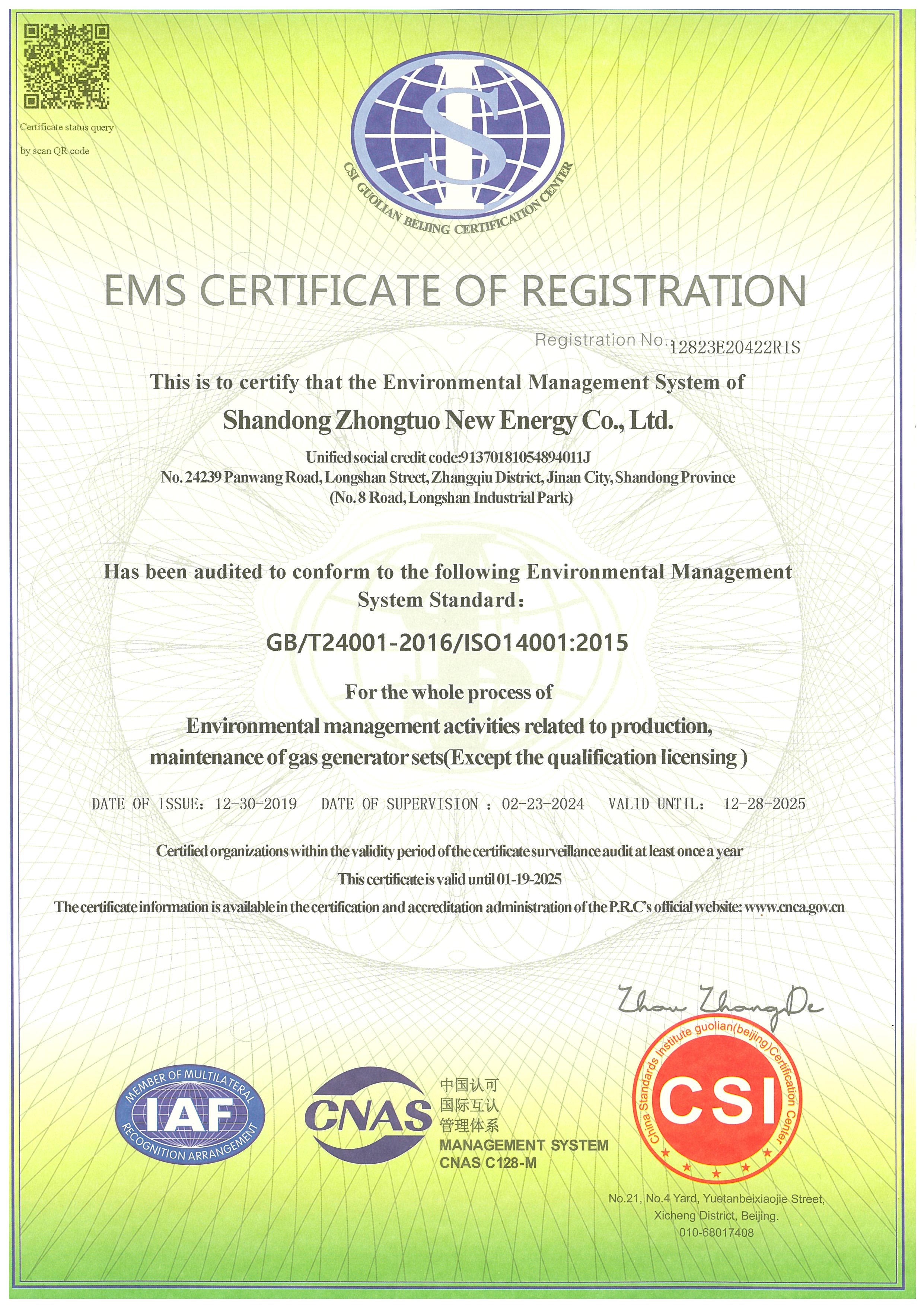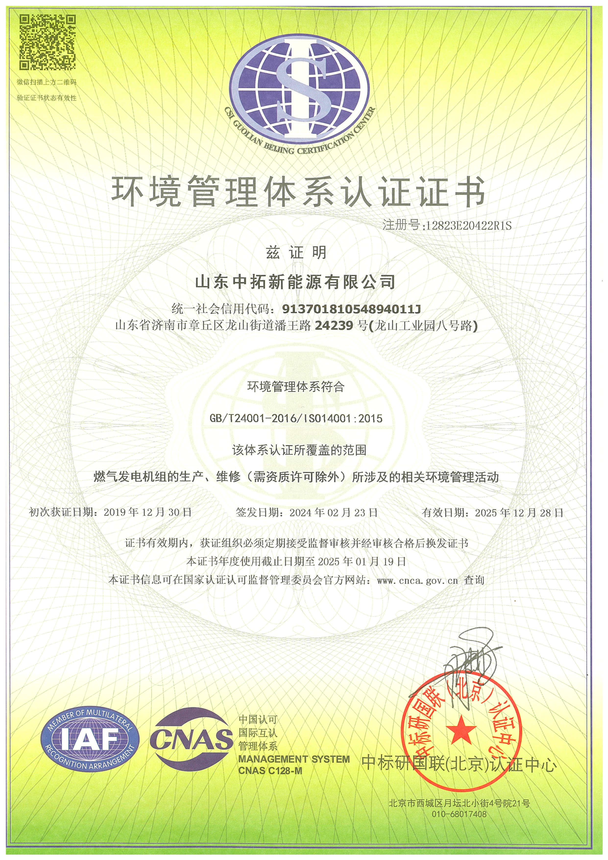 環境管理體系認證證書國際